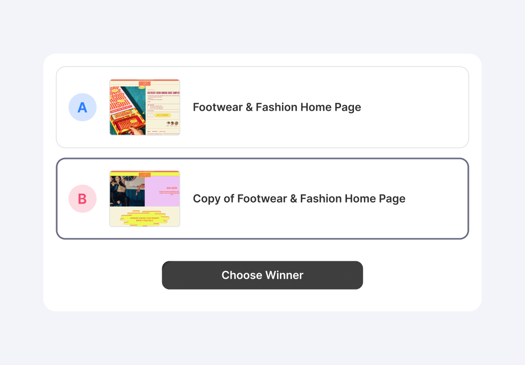 Test your new homepage, collection, and product templates as a complete journey against your current store to ensure the redesign performs better.