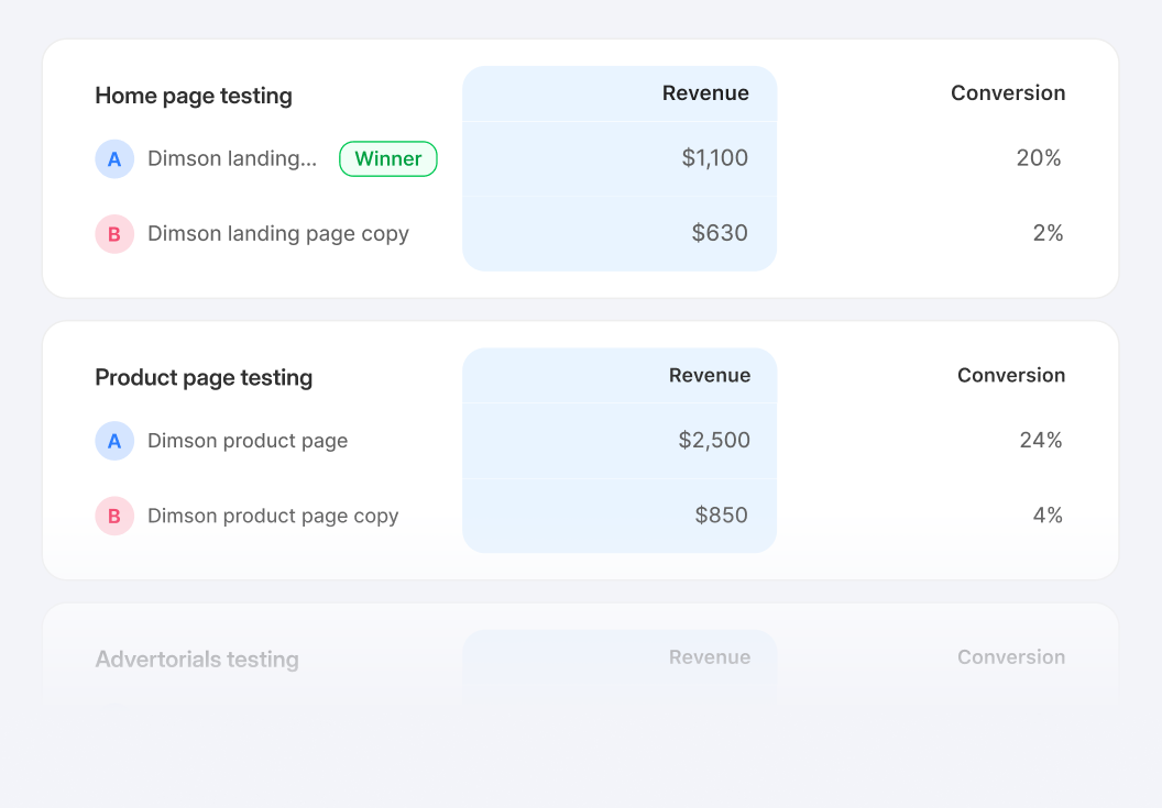 Run two versions of your funnel (advertorial → product → checkout) to see which journey drives higher add-to-carts and conversions.